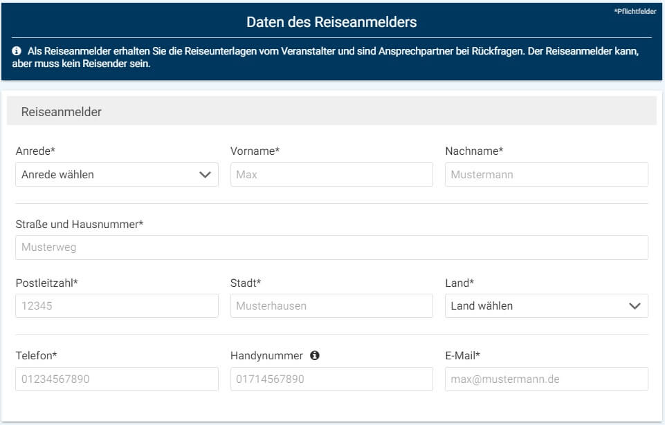 Hinweis: Bei Flugreisen achten Sie bitte auf EXAKTE Eingabe der Teilnehmerdaten wie in Ihrem Ausweisdokument, da eine spätere Namensänderung mit hohen Kosten verbunden sein kann!